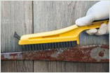 A comfortable wire brush with a rubber handle and metal scraper. It is designed for difficult jobs requiring extra scraping pressure. Stiff bristles.
